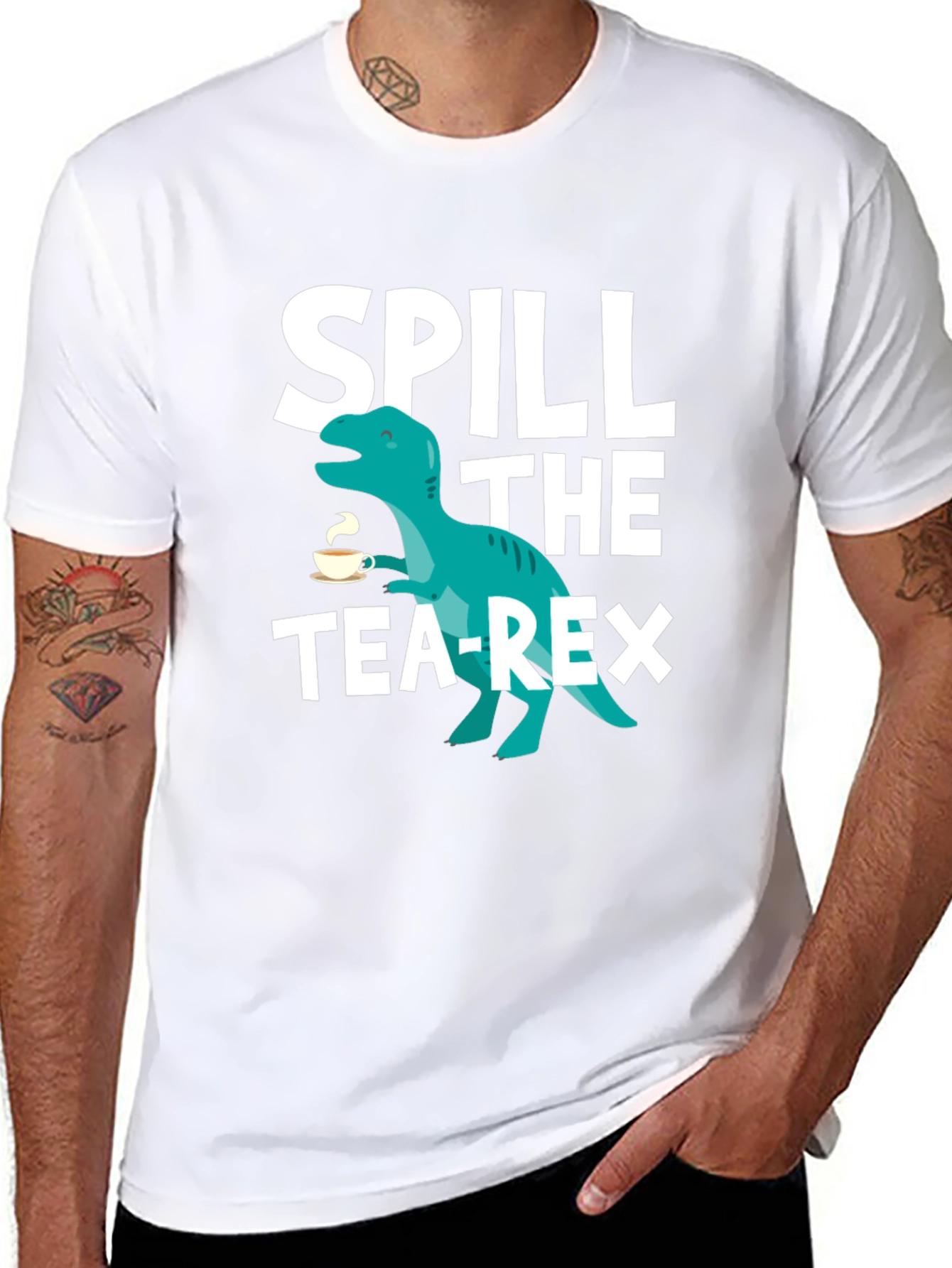 Unleash your inner dino-lover with this fun "Spill the Tea-Rex" graphic t-shirt. Crafted from comfortable, breathable fabric, this tee features a playful design of a teal dinosaur holding a cup of tea, paired with bold white lettering. The classic crew neck and short sleeve design make it a versatile addition to any casual wardrobe. Perfect for coffee lovers, dinosaur enthusiasts, or anyone with a sense of humor, this t-shirt is sure to spark conversation and bring a smile to everyone's face. Wear it on your next casual outing, to a coffee shop, or simply while relaxing at home. Express your quirky personality and grab yours today!