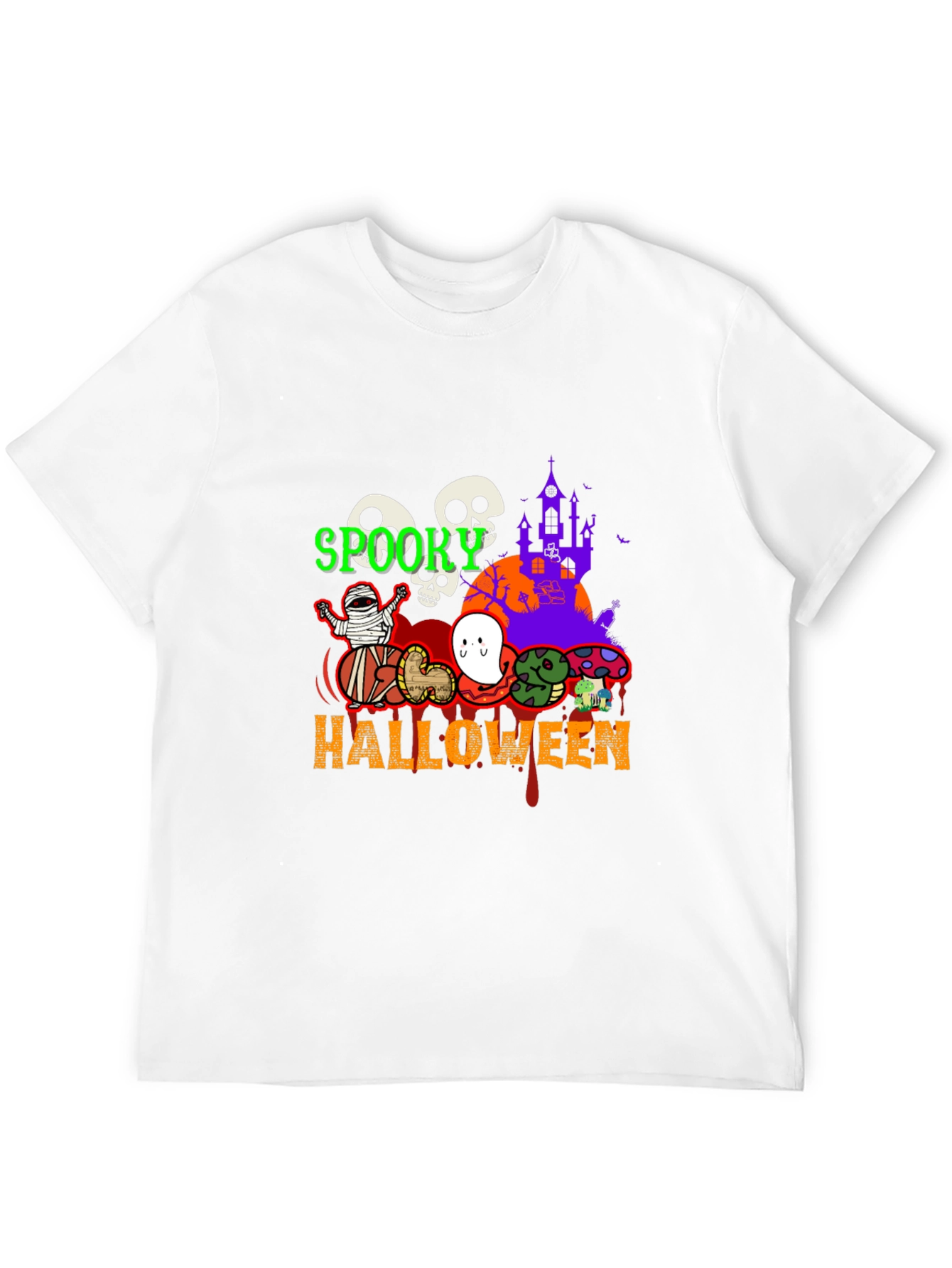 Get into the spooky spirit with this graphic tee! This black t-shirt features a playful Halloween-themed graphic with skeletons, a ghost, mummy, a spooky haunted house and the words "Spooky Halloween." Made from a comfortable material, this tee is perfect for Halloween parties, trick-or-treating, or casual wear during the spooky season. A great way to show your Halloween spirit!