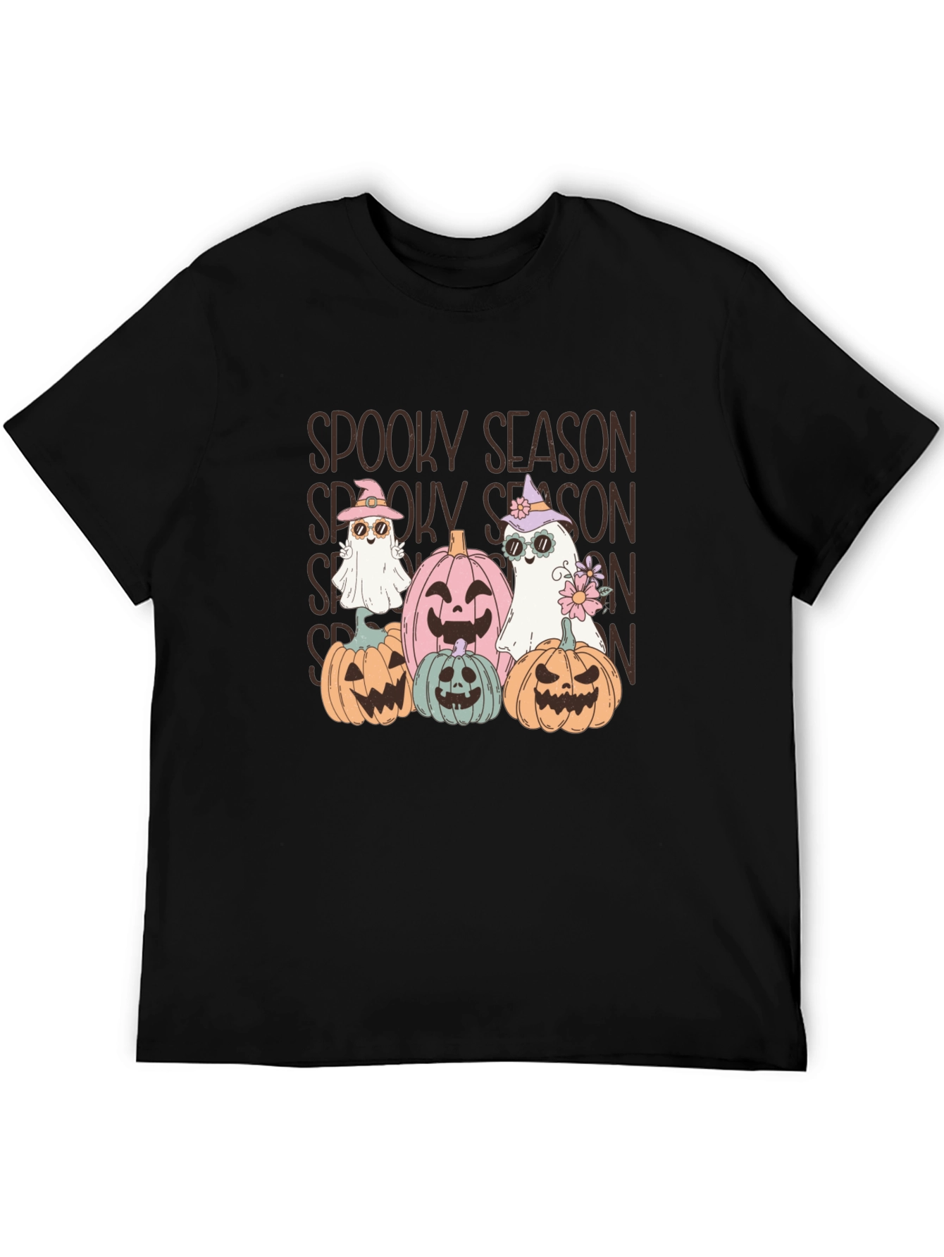Get into the Halloween spirit with this adorable Spooky Season t-shirt! Featuring cute cartoon ghosts in hats and sunglasses, surrounded by pastel-colored pumpkins, this tee is perfect for anyone who loves Halloween. The design is repeated several times for a fun, eye-catching effect. Made from comfortable material, this t-shirt is ideal for casual wear, Halloween parties, or trick-or-treating. Show off your festive side with this unique and playful design. Available in a classic black color that makes the design pop. A great addition to your spooky wardrobe!