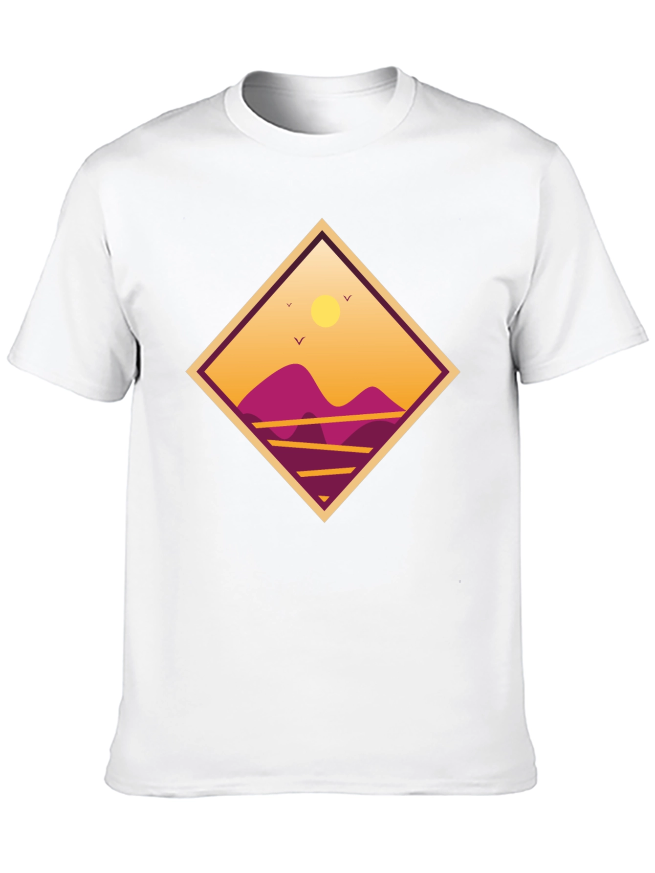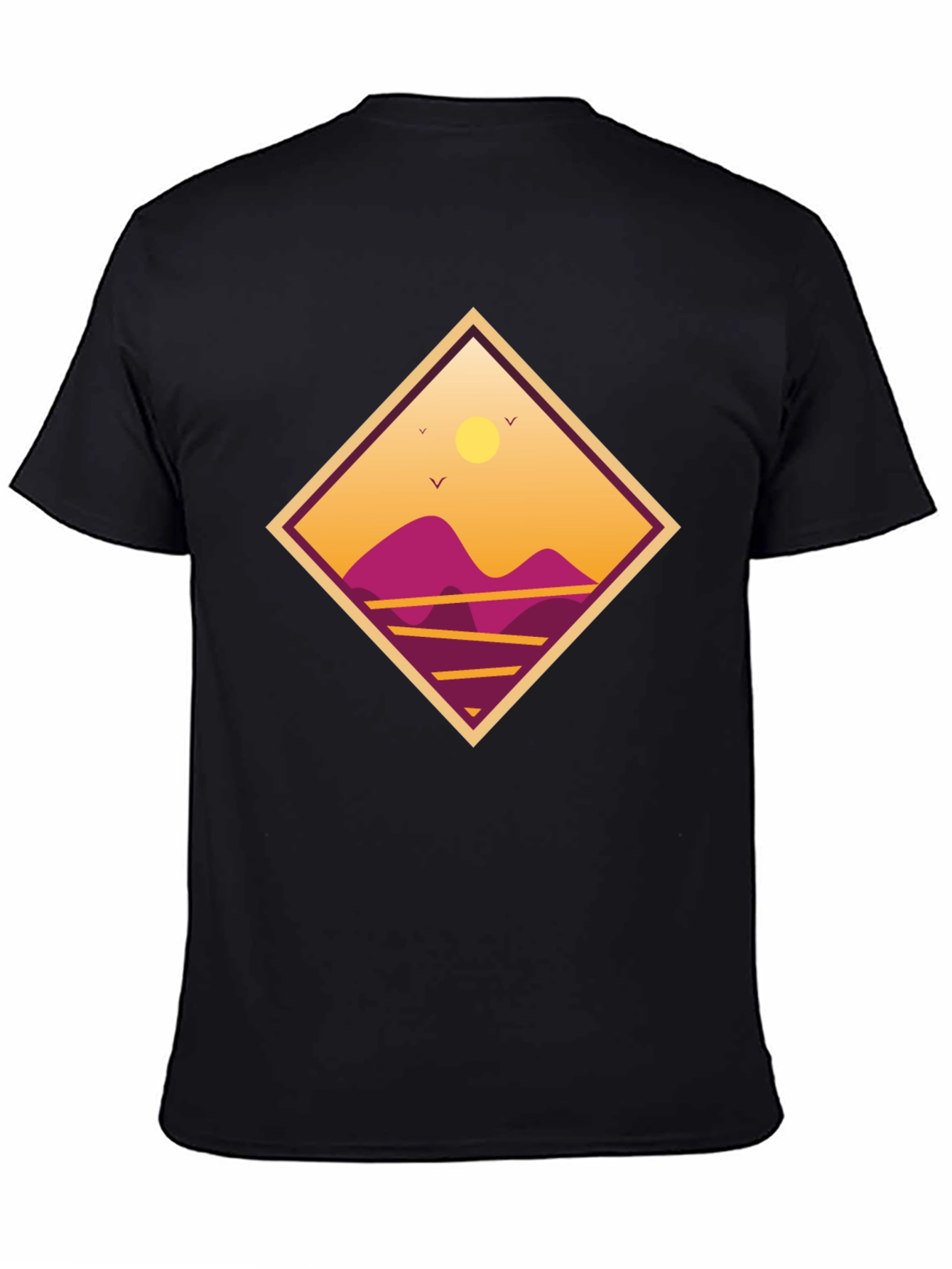 Embrace nature-inspired style with this striking black cotton t-shirt. The design features a minimalist yet captivating graphic of a sunset over mountains, framed within a geometric border. The colors are a blend of warm oranges and purples, creating a visually appealing contrast against the black background. Crafted from comfortable cotton, this tee is perfect for casual wear. Whether you're exploring the outdoors or relaxing at home, this unique t-shirt will make a statement. Pair it with jeans or shorts for a laid-back look. Show off your love for adventure with this artistic and eye-catching shirt. Available in various sizes.