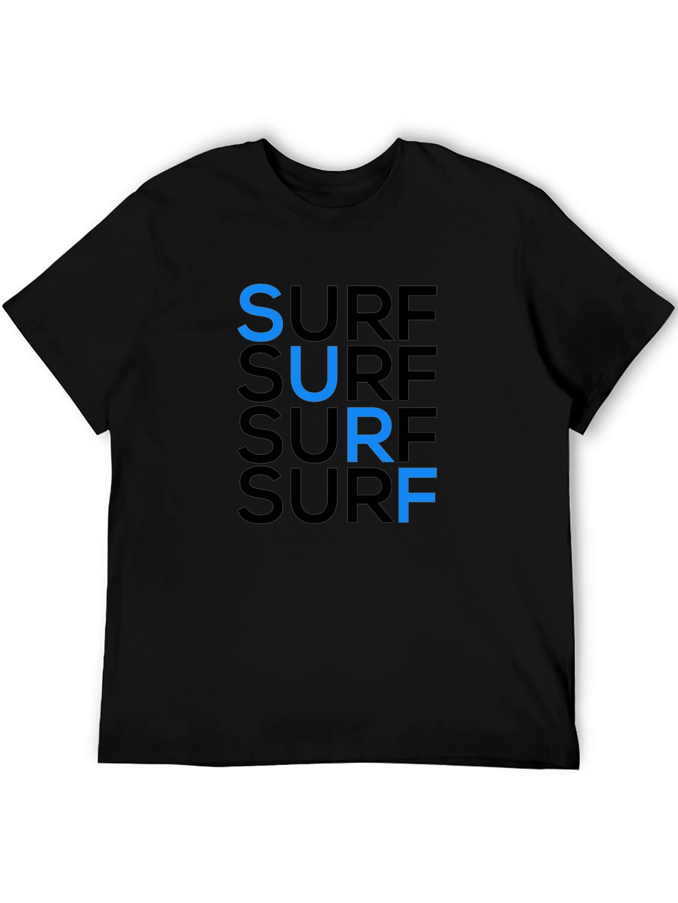 Catch a wave of style with this eye-catching surf graphic tee. Made from comfortable black cotton, this t-shirt features the word "SURF" stacked in a repeating pattern, with vibrant blue accents adding a pop of color and visual interest. The simple design makes it perfect for casual outings, beach days, or simply expressing your love for the surf lifestyle. A must-have addition to any wardrobe, this tee combines comfort and style effortlessly. Show off your laid-back vibes with this trendy graphic t-shirt.