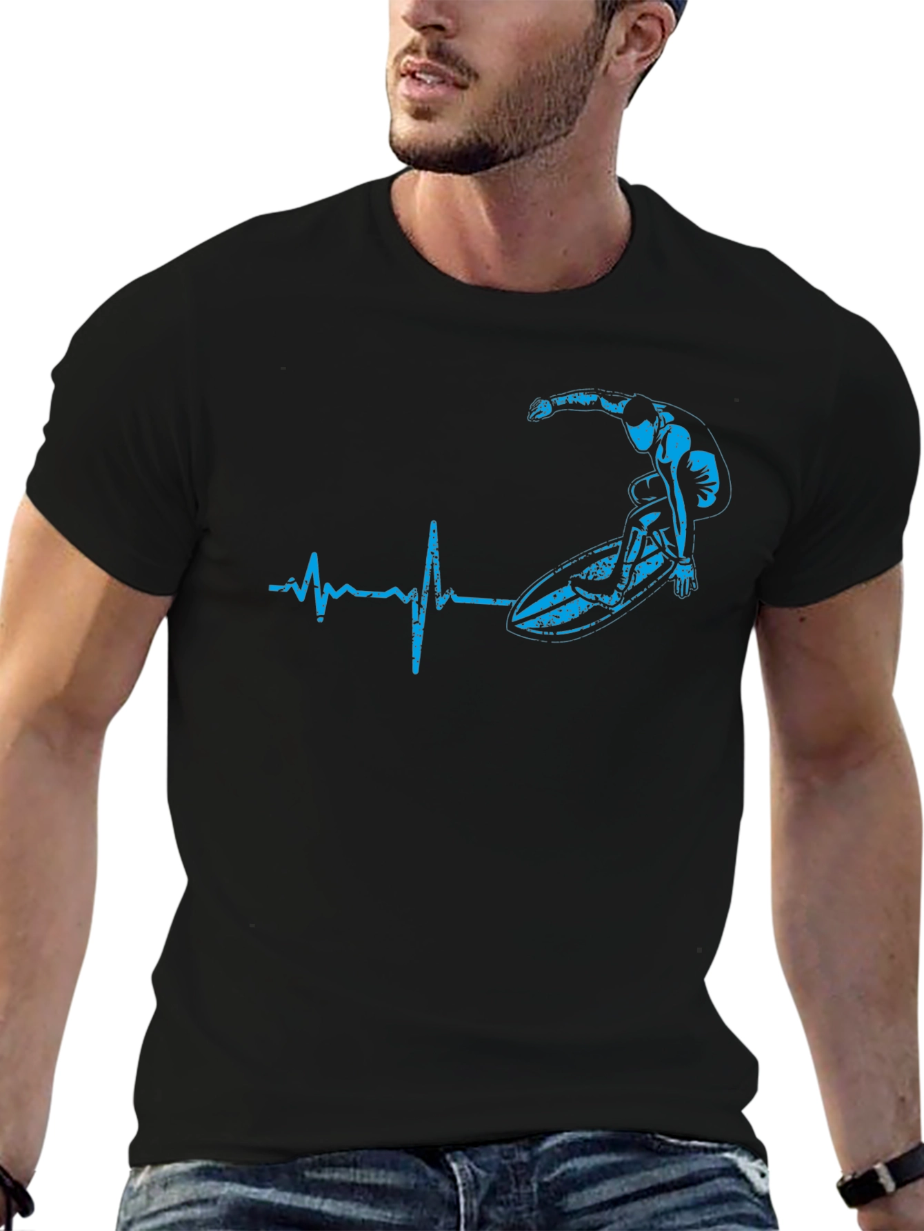 Catch the wave of style with this unique graphic tee. This black t-shirt features a cool blue design incorporating a surfer riding a wave, integrated with a heartbeat line. The shirt is made from a soft-looking fabric and has a classic fit, making it comfortable for everyday wear. Ideal for surfers, beach lovers, or anyone who appreciates original designs, this tee is perfect for casual outings, surfing trips, or adding a touch of coastal flair to your wardrobe. Express your passion for surfing with this eye-catching shirt.