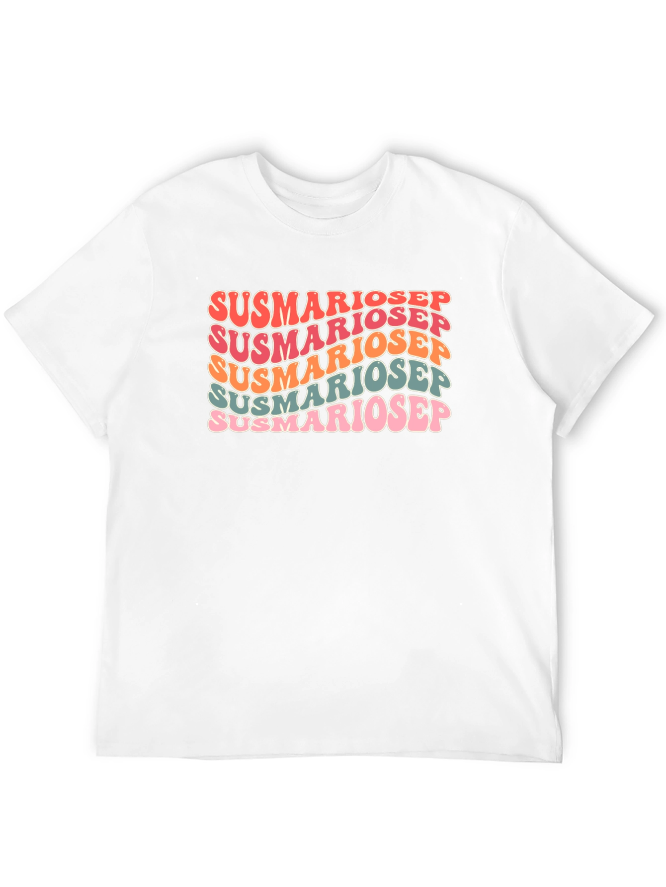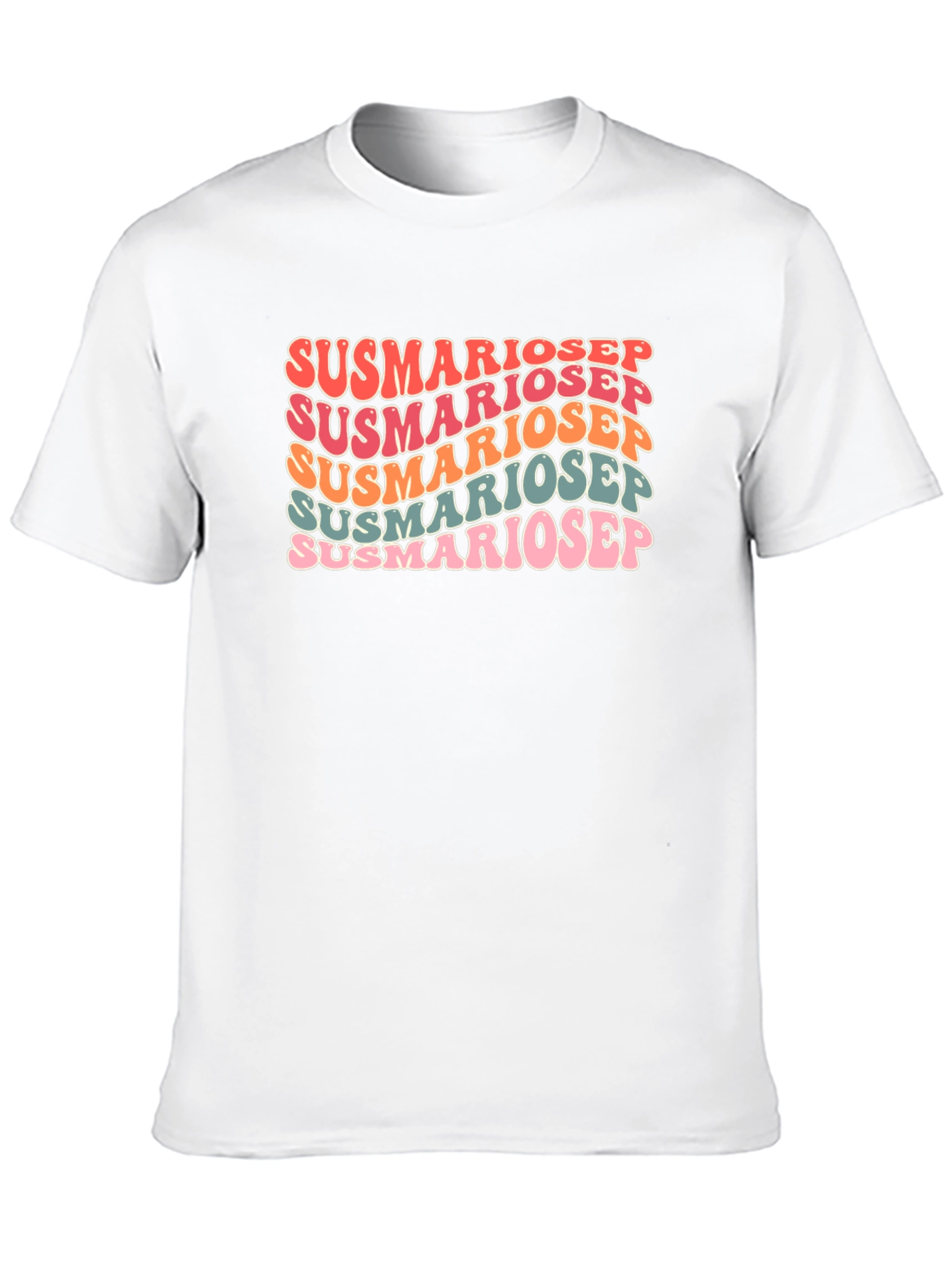 Show off your style with this retro-inspired black t-shirt featuring the word "Susmariosep" repeated in stacked lines with various eye-catching colors including coral, orange, teal and pink. The retro font gives it a vintage feel, while the clean design makes it easy to pair with any outfit. Perfect for everyday wear or as a statement piece. This classic-fit tee is both comfortable and stylish. A great gift for friends, family, or yourself!
