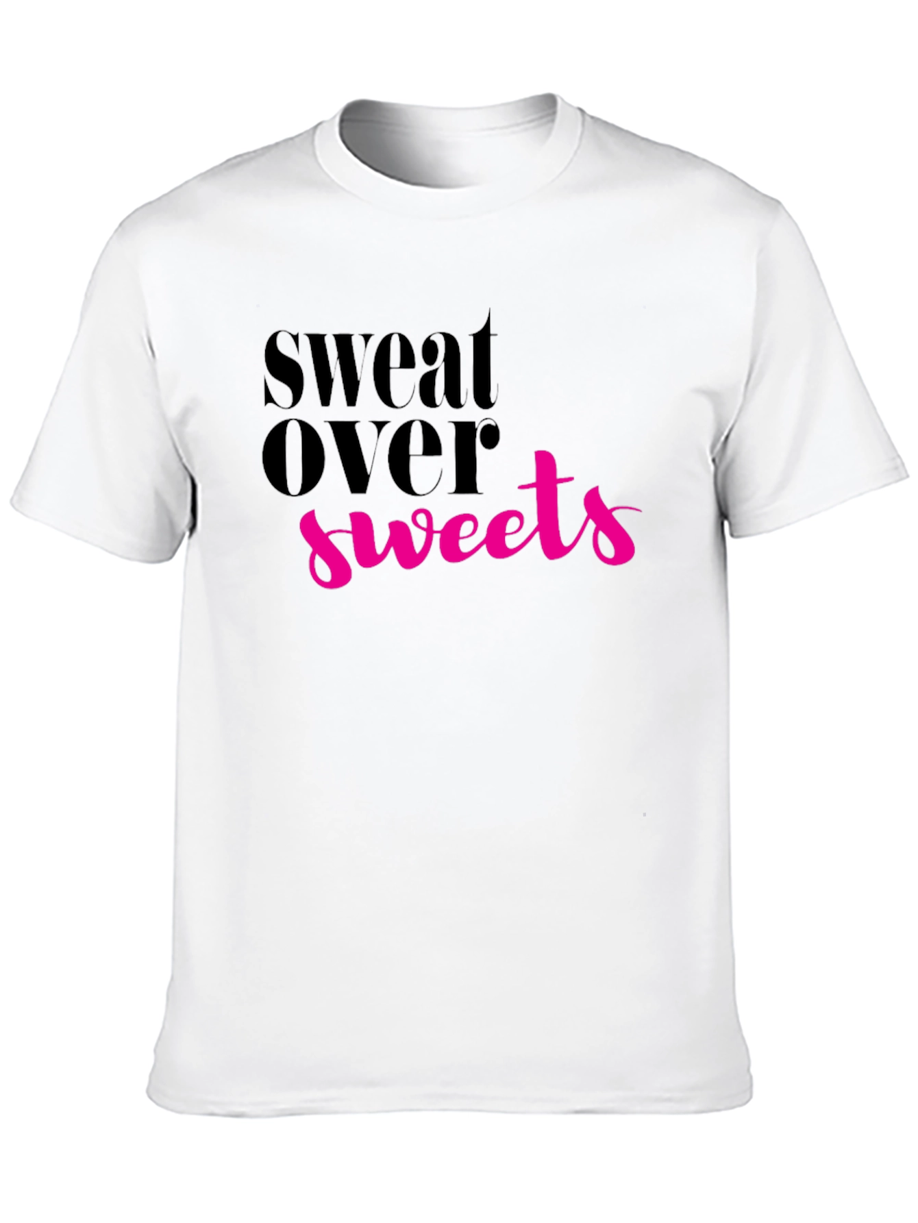 Stay motivated with this stylish black tee featuring the playful slogan "Sweat Over Sweets." The design is printed in bold black font for "Sweat Over" and eye-catching pink for "Sweets." Crafted from comfortable, breathable fabric, this shirt is perfect for workouts, casual wear, or making a statement. Show off your dedication to fitness with this trendy and motivational t-shirt. It's a great addition to your activewear collection or a fun gift for fitness enthusiasts. Get yours today and inspire those around you!