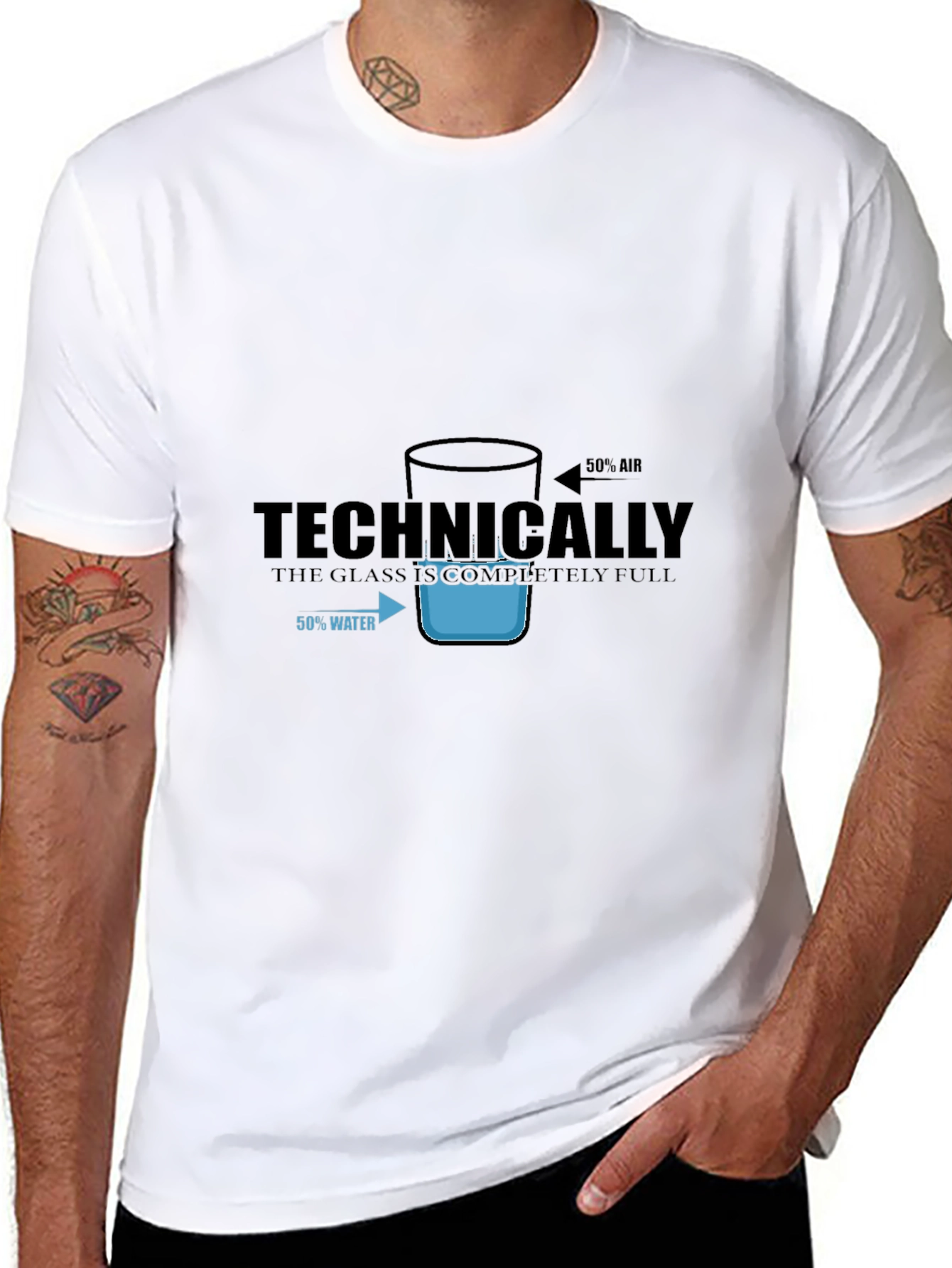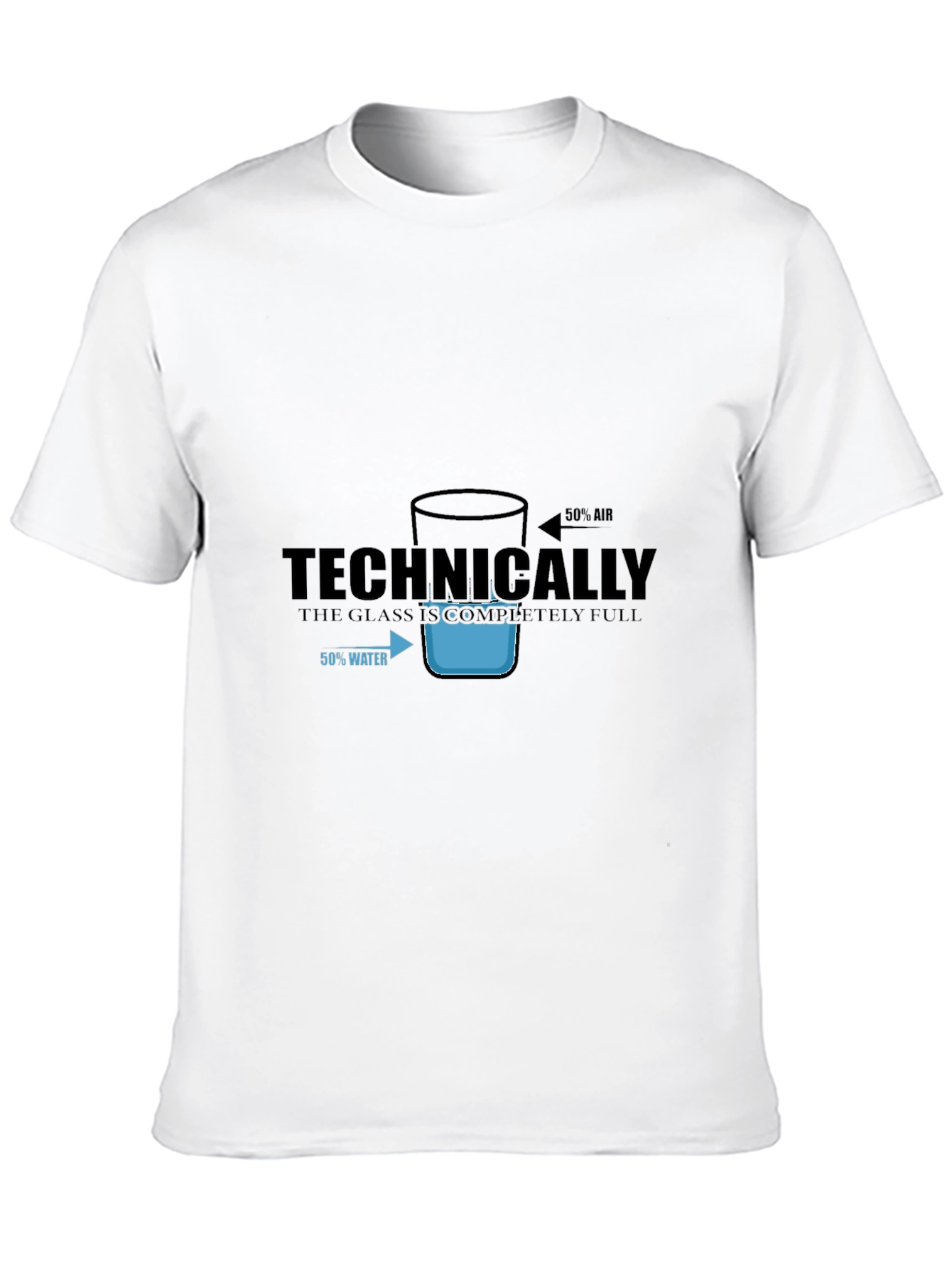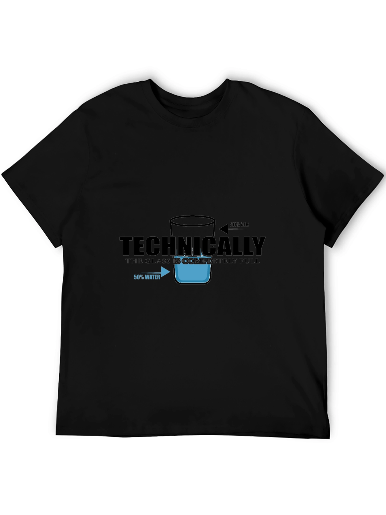 This unique black t-shirt features a clever design showcasing a glass half-filled with water and air, playfully stating that the glass is "technically completely full." Ideal for science enthusiasts, optimists, or anyone with a sense of humor, this tee is sure to spark conversations. The graphic print is eye-catching and clearly displays the comical slogan. Made from a comfortable, breathable fabric, this shirt is perfect for casual wear, whether you're heading to a science convention, hanging out with friends, or simply want to add a touch of wit to your wardrobe. Express your unique perspective with this fun and stylish t-shirt!