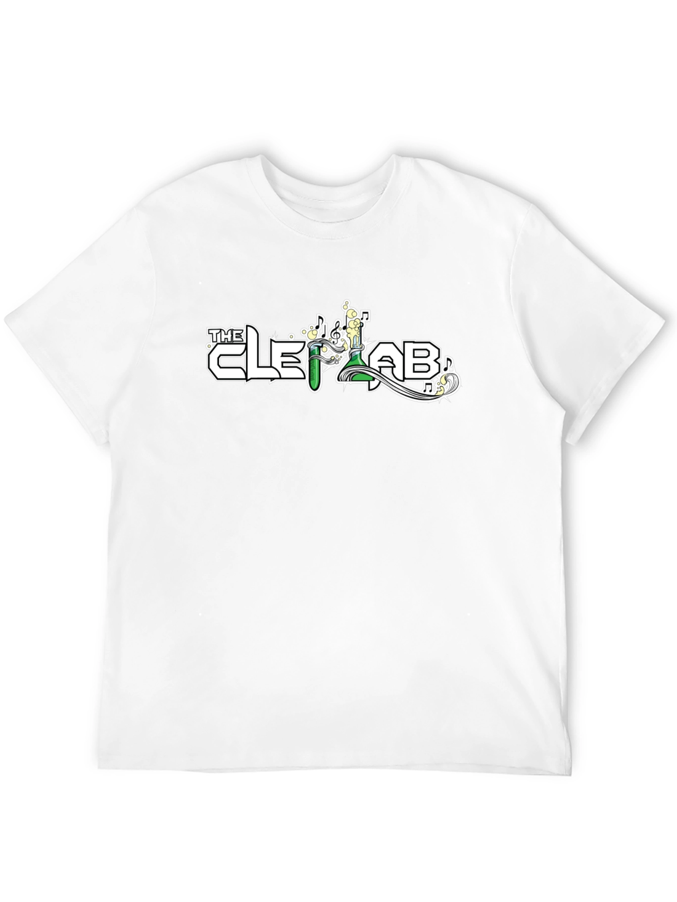 This stylish men's black t-shirt features a unique and eye-catching graphic print on the front. The design incorporates the text "THE CLE LAB" with science-themed imagery, including a test tube, laboratory flask, bubbles and musical notes, suggesting a playful blend of science and creativity. The print is in a contrasting white color with a touch of green, making it pop against the black backdrop. Made from what appears to be a soft and comfortable fabric, this t-shirt is perfect for casual wear. It's ideal for those who appreciate quirky and intellectual designs. Wear it to express your unique style and stand out from the crowd.