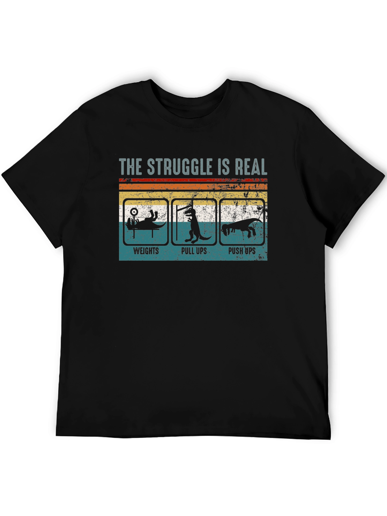 Show off your gym humor with this unique graphic t-shirt. Featuring a vintage-inspired design, this black tee displays a humorous take on working out with dinosaur illustrations doing weights, pull-ups, and push-ups. The phrase "The Struggle is Real" is printed above the graphic in distressed font to provide a retro look. Made from comfortable materials, it's perfect for casual wear, gym sessions, or lounging at home. This t-shirt is a fun way to express your love for fitness and comedy. A perfect gift for the fitness enthusiast with a sense of humor!