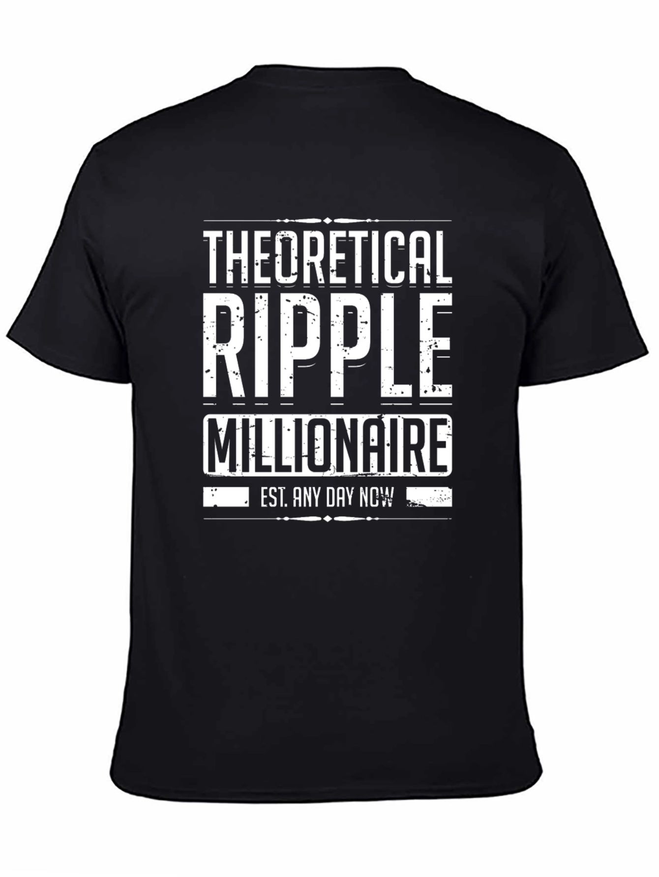 This black t-shirt features a bold, white graphic print that reads "THEORETICAL RIPPLE MILLIONAIRE" in a distressed, block letter style. The phrase "EST. ANY DAY NOW" is printed in smaller letters below, adding a touch of humor. Made from soft, breathable fabric, this shirt is comfortable for all-day wear. Its classic fit makes it a versatile addition to any casual wardrobe. Perfect for cryptocurrency enthusiasts or anyone with a good sense of humor. This tee is sure to be a conversation starter, showcasing your aspirations with a fun, stylish twist. Wear it to your next crypto meetup, casual Friday at the office, or while lounging at home.