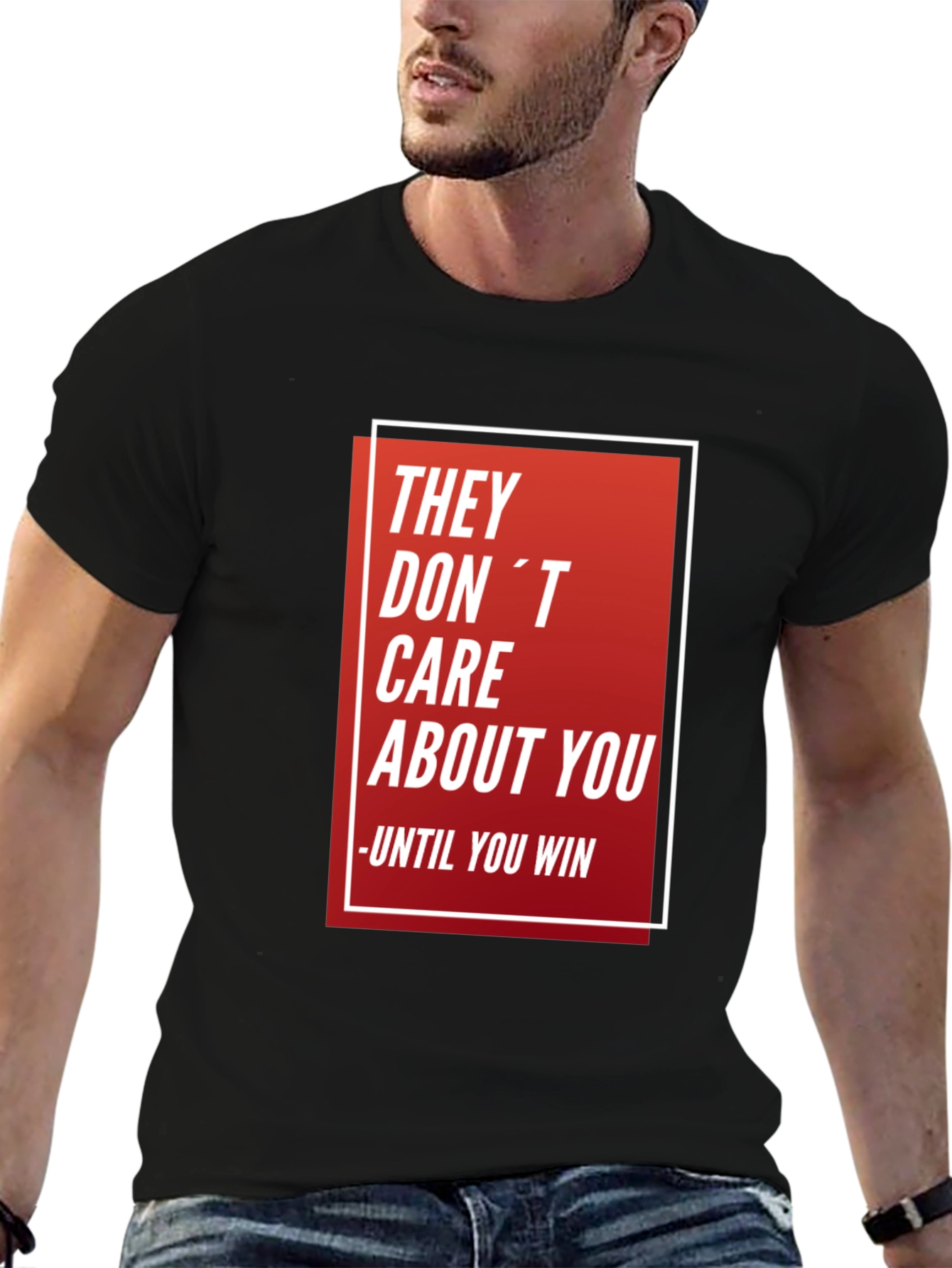 This stylish black t-shirt features a bold graphic print with the saying "They Don't Care About You - Until You Win". The design is set against a red gradient background, framed by a white rectangular border, making the message pop. Made from comfortable materials, this tee is perfect for everyday wear, casual outings, or making a statement. Show off your determination and resilience with this eye-catching shirt. Ideal for anyone with a driven mindset and a desire to succeed. Get yours today and inspire those around you!