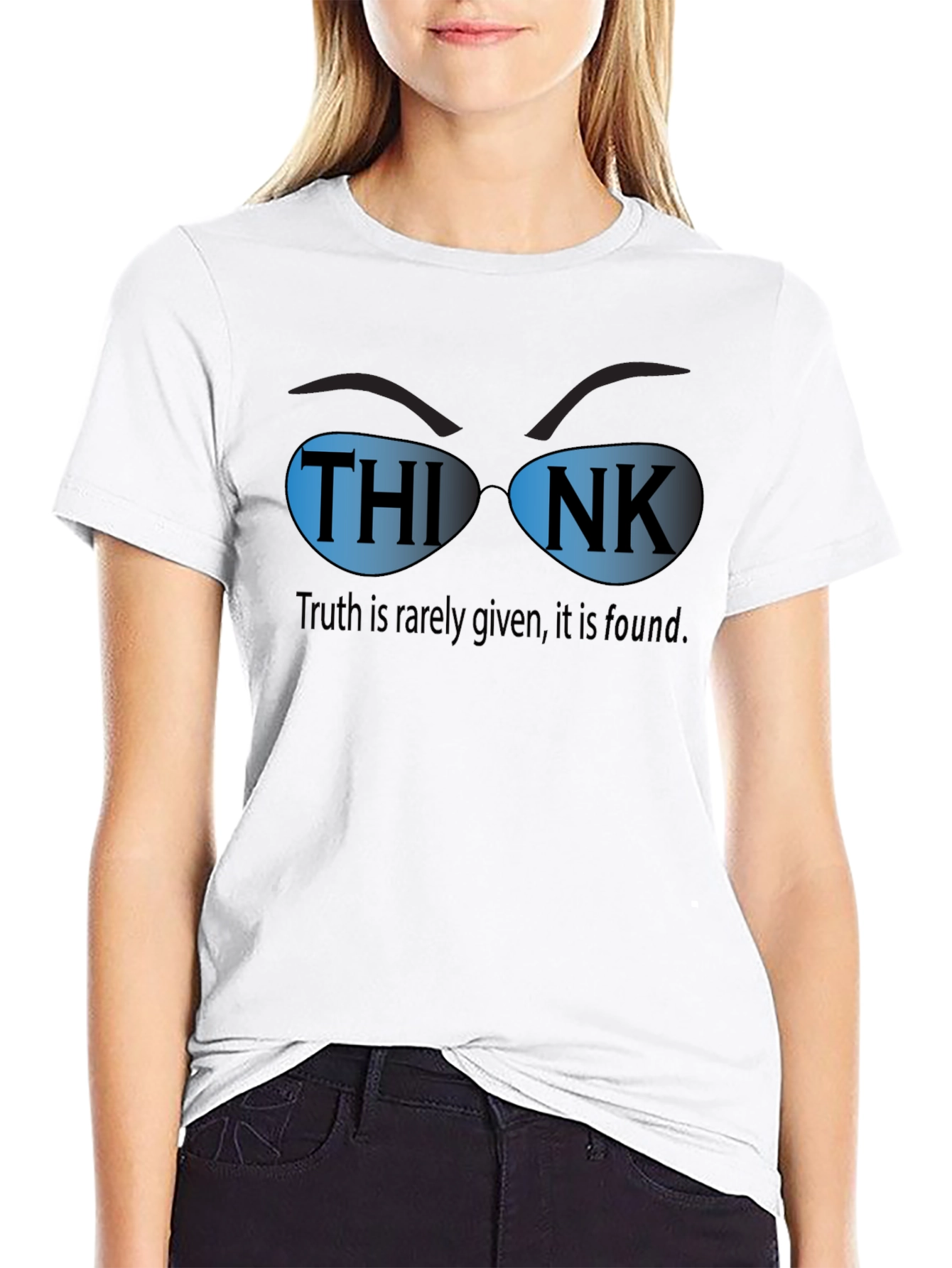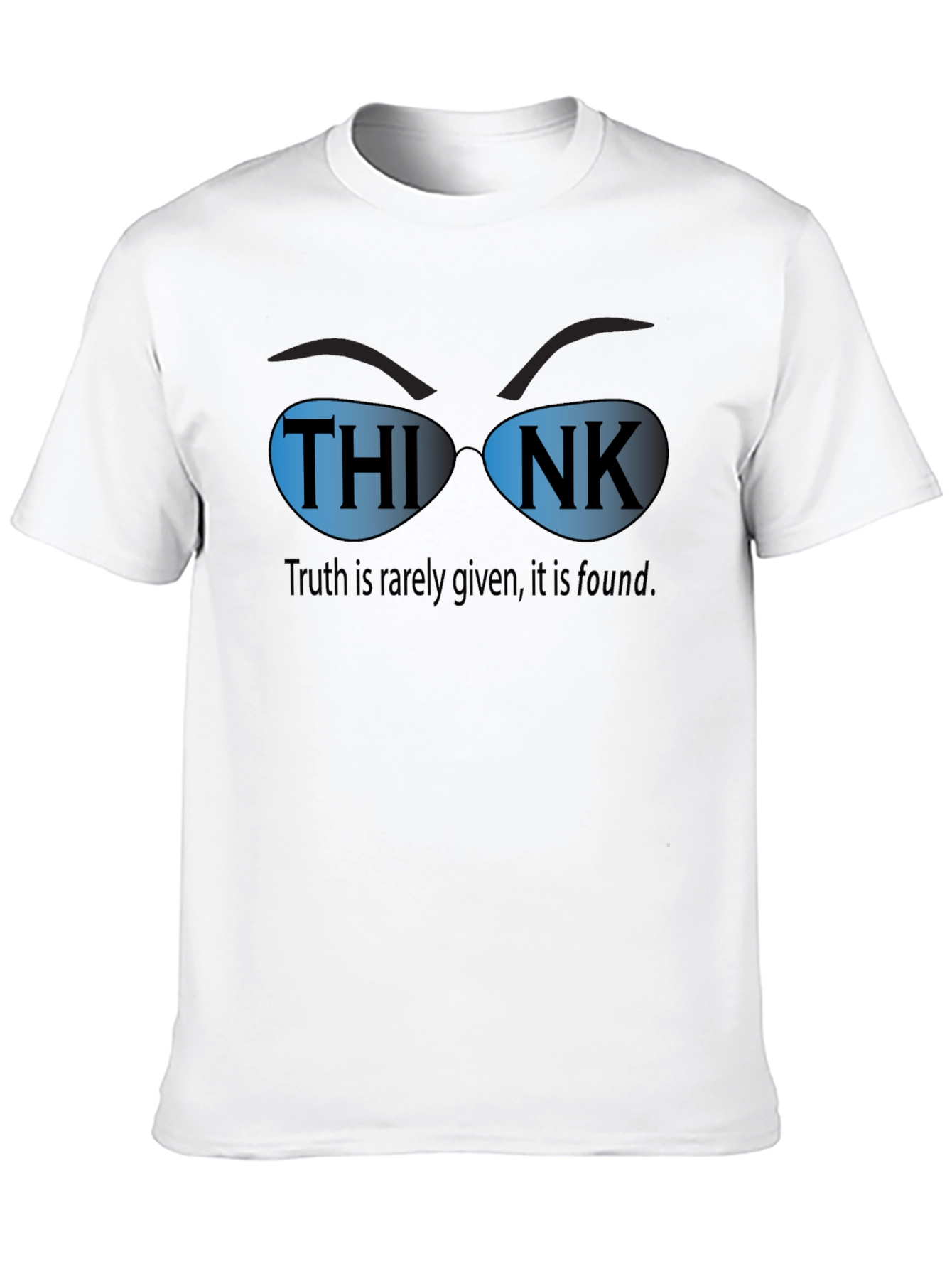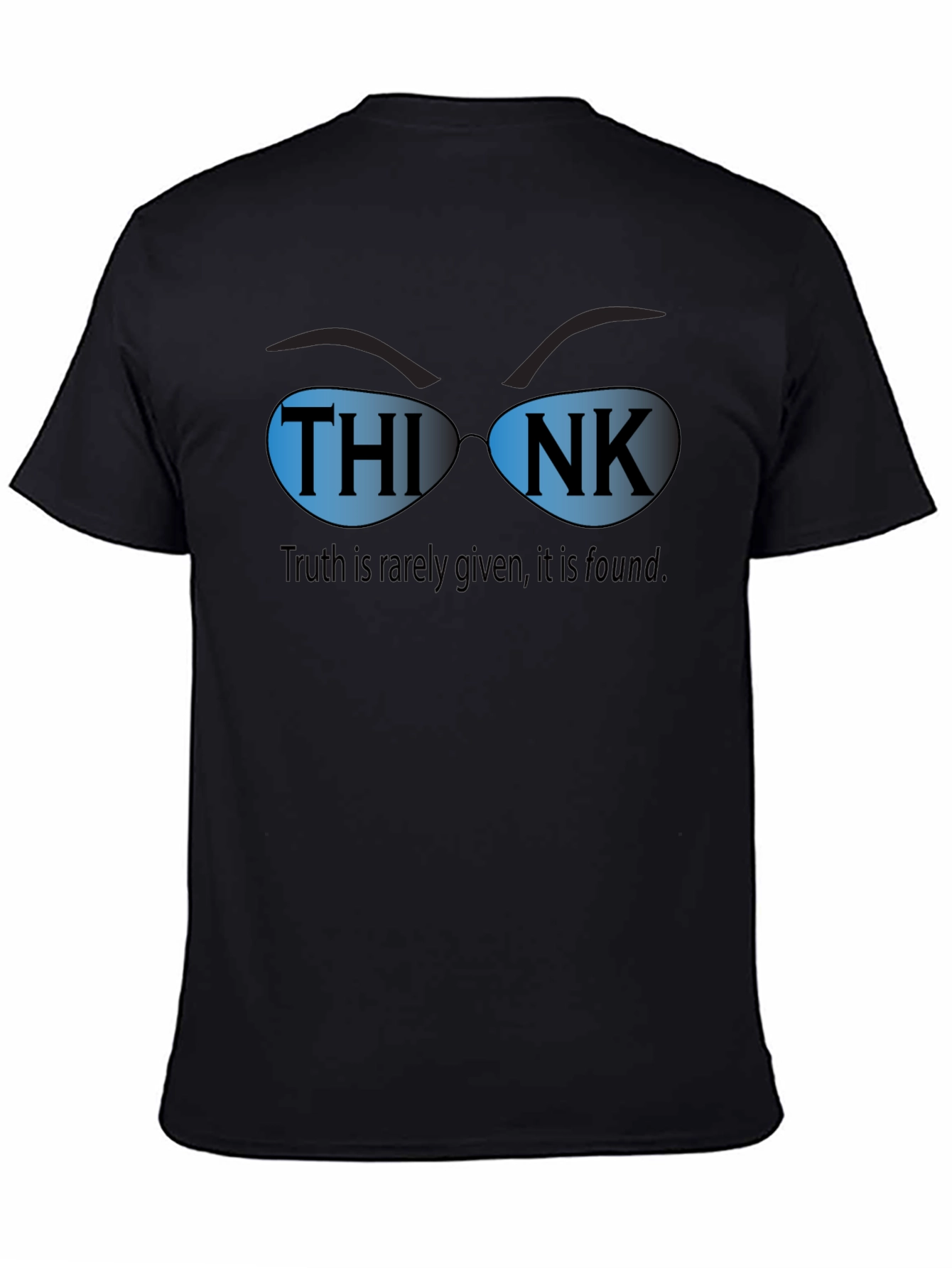 Express your unique perspective with this eye-catching graphic t-shirt. The design features stylized sunglasses with the words "THI" and "NK" inside the lenses, creating a clever play on words. Below, the phrase "Truth is rarely given, it is found." adds an intellectual touch. Crafted from what appears to be a comfortable cotton or cotton blend fabric, this black tee offers a classic fit that's perfect for everyday wear. The bold graphic makes it a standout piece, ideal for casual outings, social gatherings, or expressing your individuality. Wear your thoughts on your sleeve – or rather, your chest – with this thought-provoking t-shirt.