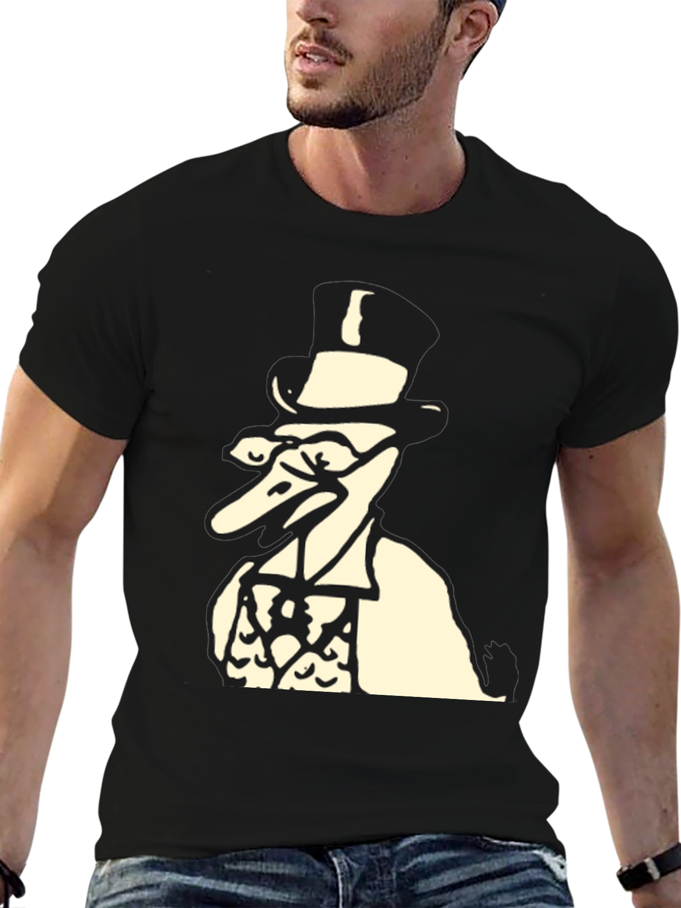 Show off your quirky side with this eye-catching black T-shirt. The shirt features a unique graphic of a sophisticated duck wearing a top hat and glasses, adding a touch of whimsical charm to your everyday wardrobe. Made from what appears to be comfortable, breathable fabric, this tee is perfect for casual outings, relaxed weekends, or as a conversation starter at social gatherings. Pair it with jeans or shorts for a stylish and fun look that showcases your unique personality.