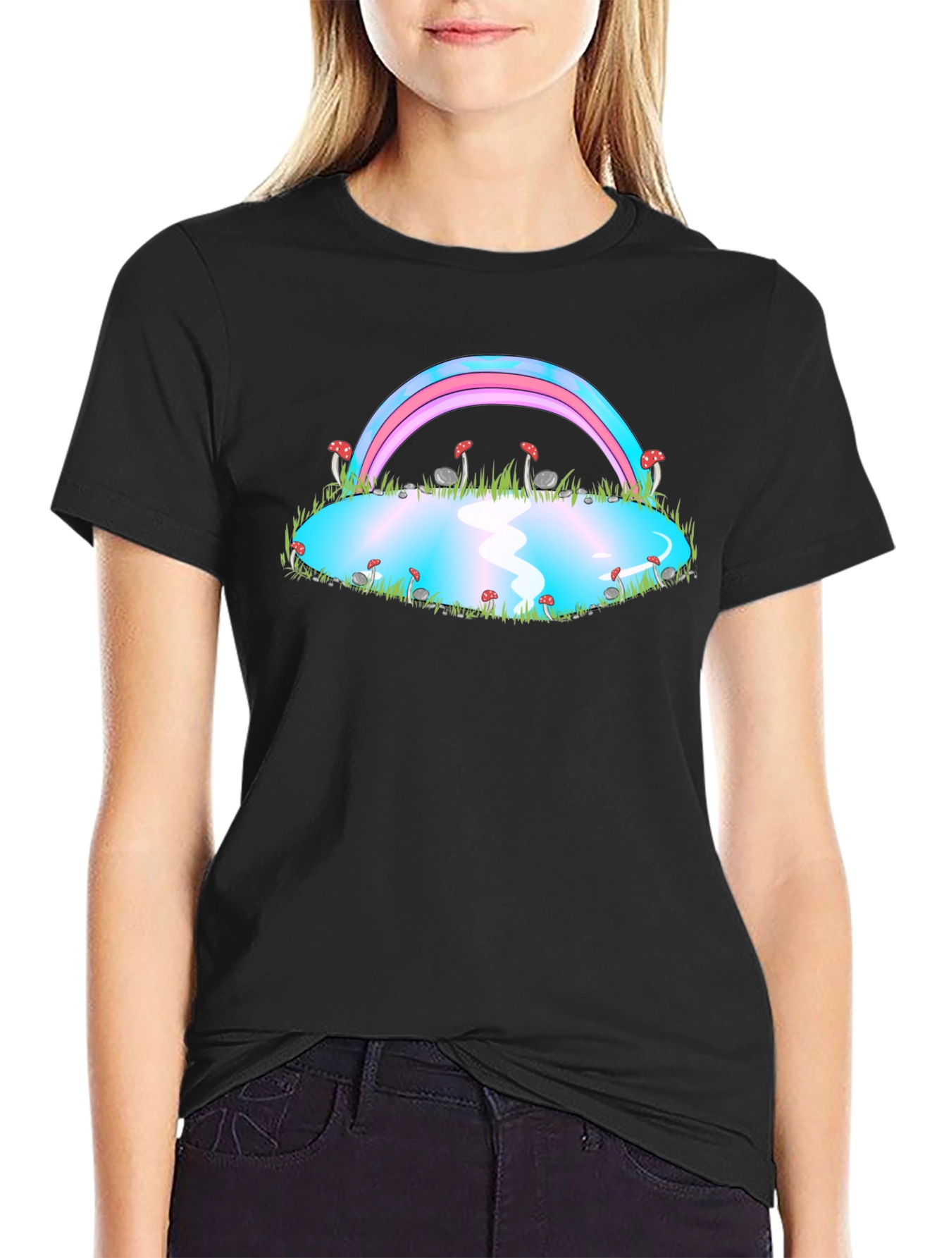 Show your support with this unique t-shirt! Featuring a whimsical design of a pond with a trans pride rainbow arching over it, complete with charming mushrooms and stones around the water's edge. The vibrant colors pop against the dark fabric, making this a stylish way to express yourself or show allyship. Comfortable and eye-catching, this t-shirt is perfect for casual wear, pride events, or as a thoughtful gift for someone special. Let your true colors shine with this one-of-a-kind piece!