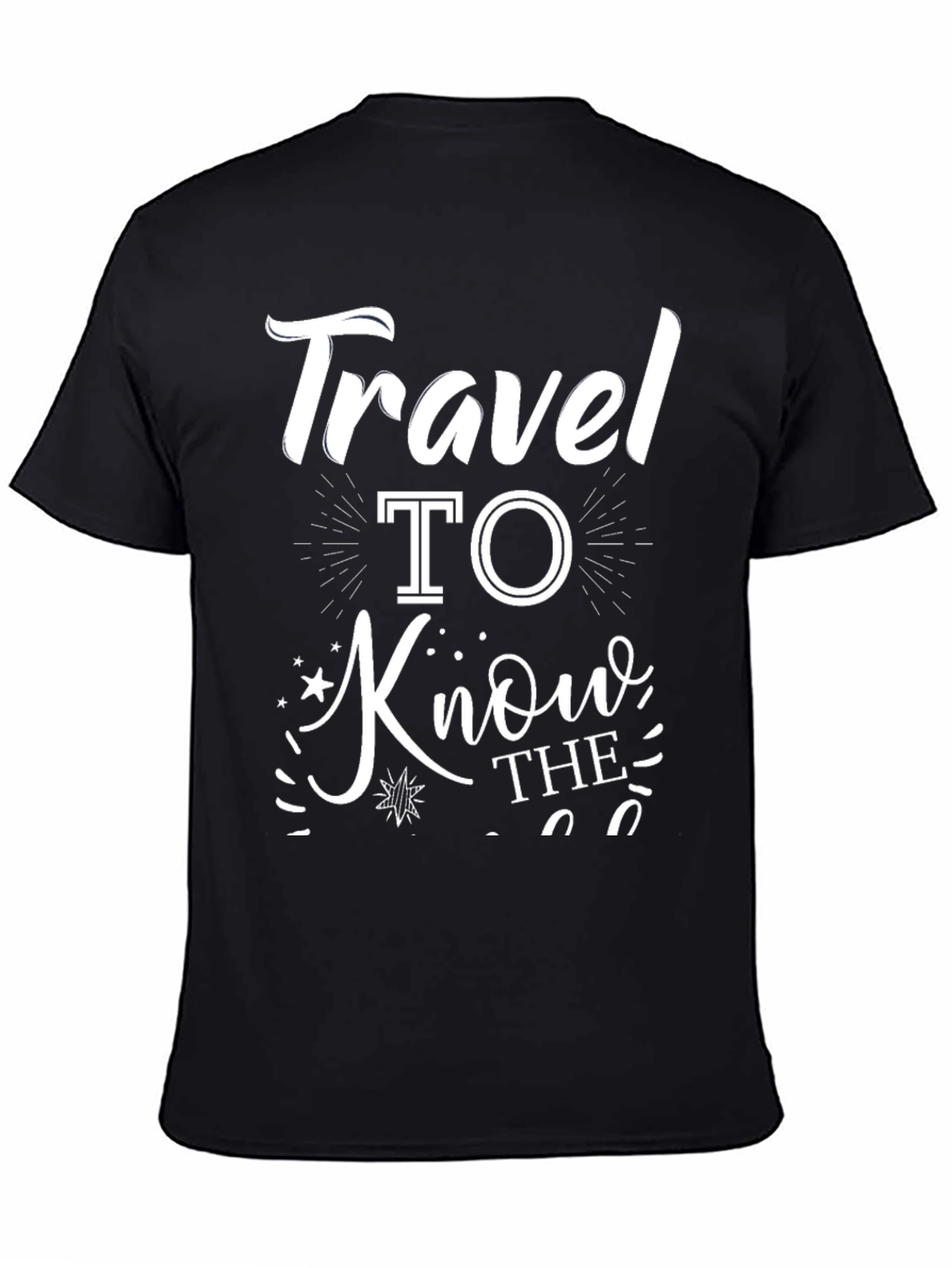 Embrace your wanderlust with this stylish black t-shirt featuring the inspiring phrase, "Travel To Know The World." The design showcases a clean, white font with decorative accents like stars and radiating lines, giving it a modern and adventurous feel. Made from what appears to be a soft and breathable cotton blend, this tee offers both comfort and durability for your everyday adventures. This shirt is ideal for casual outings, travel adventures, or simply expressing your passion for exploration. Pair it with jeans or shorts for a relaxed yet trendy look. Let this shirt be a conversation starter and a reminder to explore all that life has to offer!