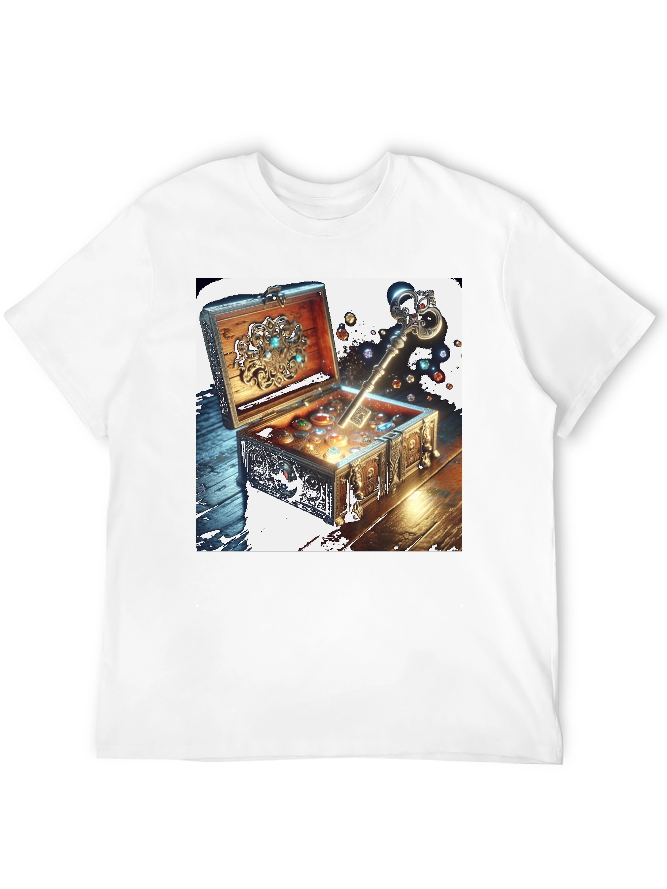 Discover the allure of the Treasure Key Black Tee. This striking garment showcases a vibrant graphic print of an ornate treasure chest overflowing with jewels and a magical key. The intricate design evokes a sense of adventure and mystery. Crafted from a soft, comfortable fabric, this tee offers a relaxed fit that is perfect for everyday wear. Ideal for those who appreciate unique, eye-catching apparel, this shirt is a conversation starter and a wardrobe staple. Dress it up or down for a casual yet stylish look.