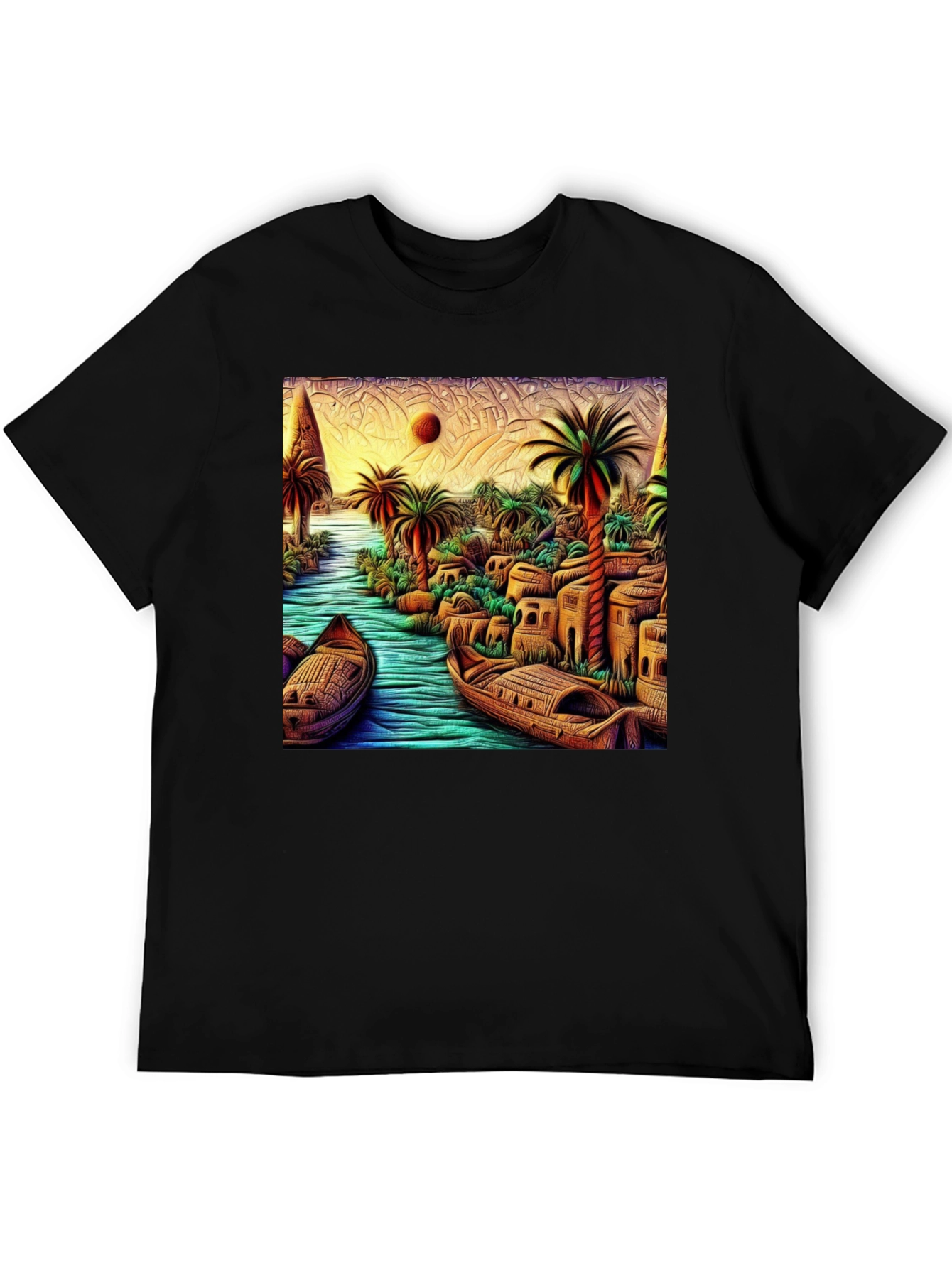 Capture the essence of paradise with this unique black t-shirt featuring a vibrant tropical river art print. This eye-catching design showcases a serene river scene, complete with lush palm trees, boats, and colorful architecture under a bright sun. Made from soft, breathable fabric, this tee offers superior comfort for everyday wear. The detailed, high-quality print makes this t-shirt a wearable work of art. Perfect for casual outings, vacations, or simply expressing your love for tropical landscapes. Stand out from the crowd with this stylish and comfortable piece that brings a touch of paradise to your wardrobe. Ideal for those who appreciate artistic and vibrant designs.