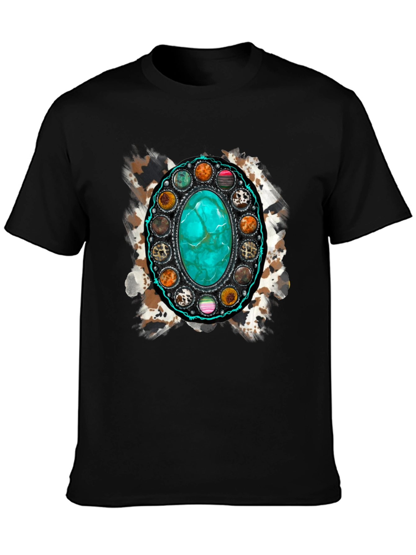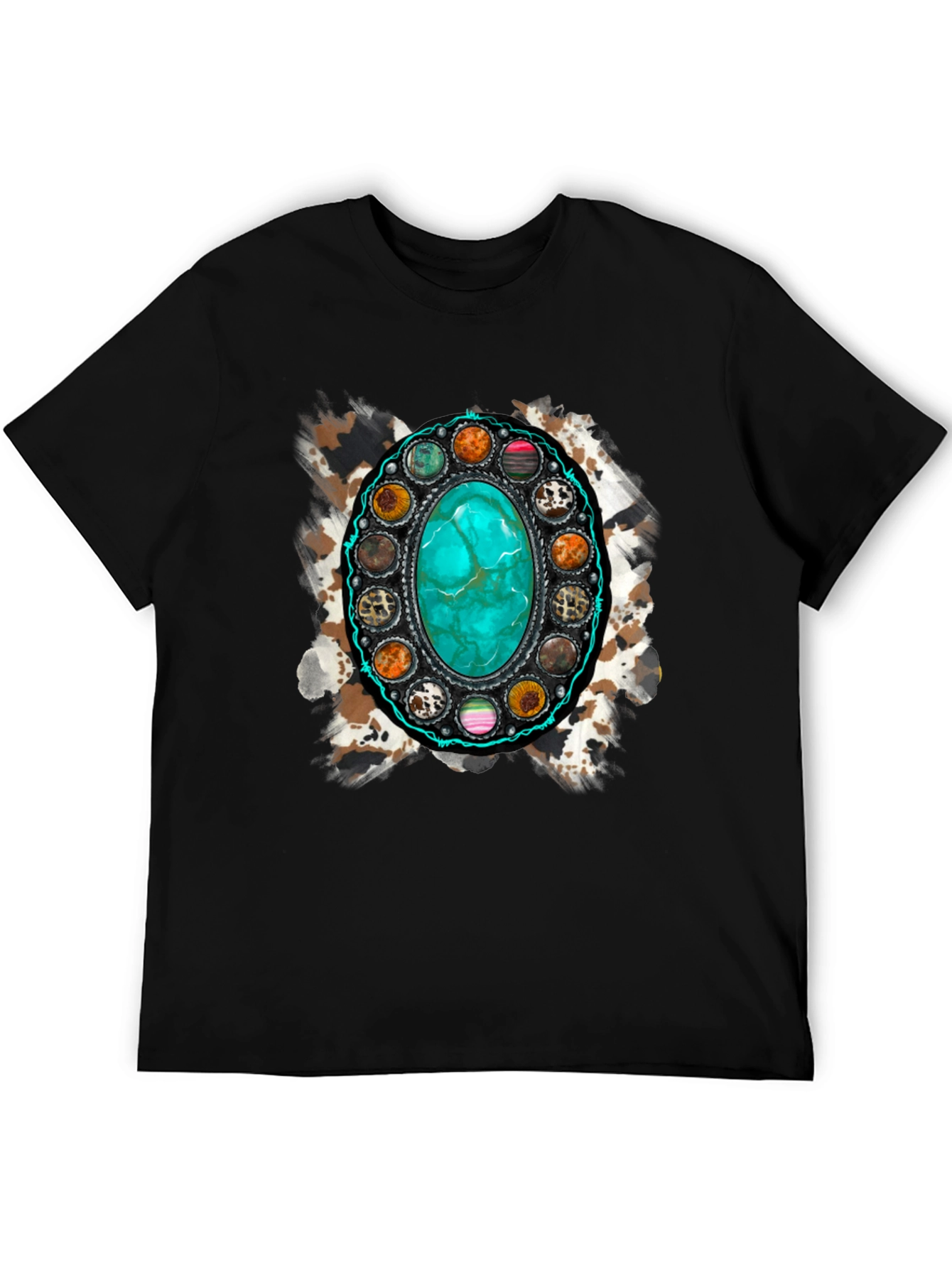 Elevate your style with this eye-catching graphic tee. The focal point is a stunning, digitally printed design featuring a turquoise stone surrounded by decorative elements, layered over a subtle animal print background. Crafted from a comfortable, breathable fabric, this shirt is perfect for everyday wear. The bold design makes it a statement piece, ideal for casual outings, concerts, or adding a touch of personality to any outfit. Pair it with jeans or shorts for a relaxed yet stylish look. Express your unique flair with this standout tee.