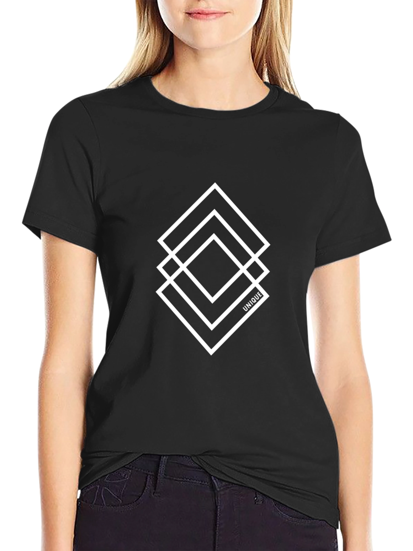 Elevate your style with this modern black t-shirt. Featuring a bold, eye-catching geometric design comprised of three overlapping white squares. The subtle 'UNIQUE' accent adds an exclusive touch. Made from a comfortable, breathable fabric, this tee is perfect for everyday wear or a night out. Pair it with jeans or chinos for a cool, casual look. Stand out from the crowd and express your individuality with this striking t-shirt. A must-have addition to any fashion-forward wardrobe, guaranteed to make a statement.