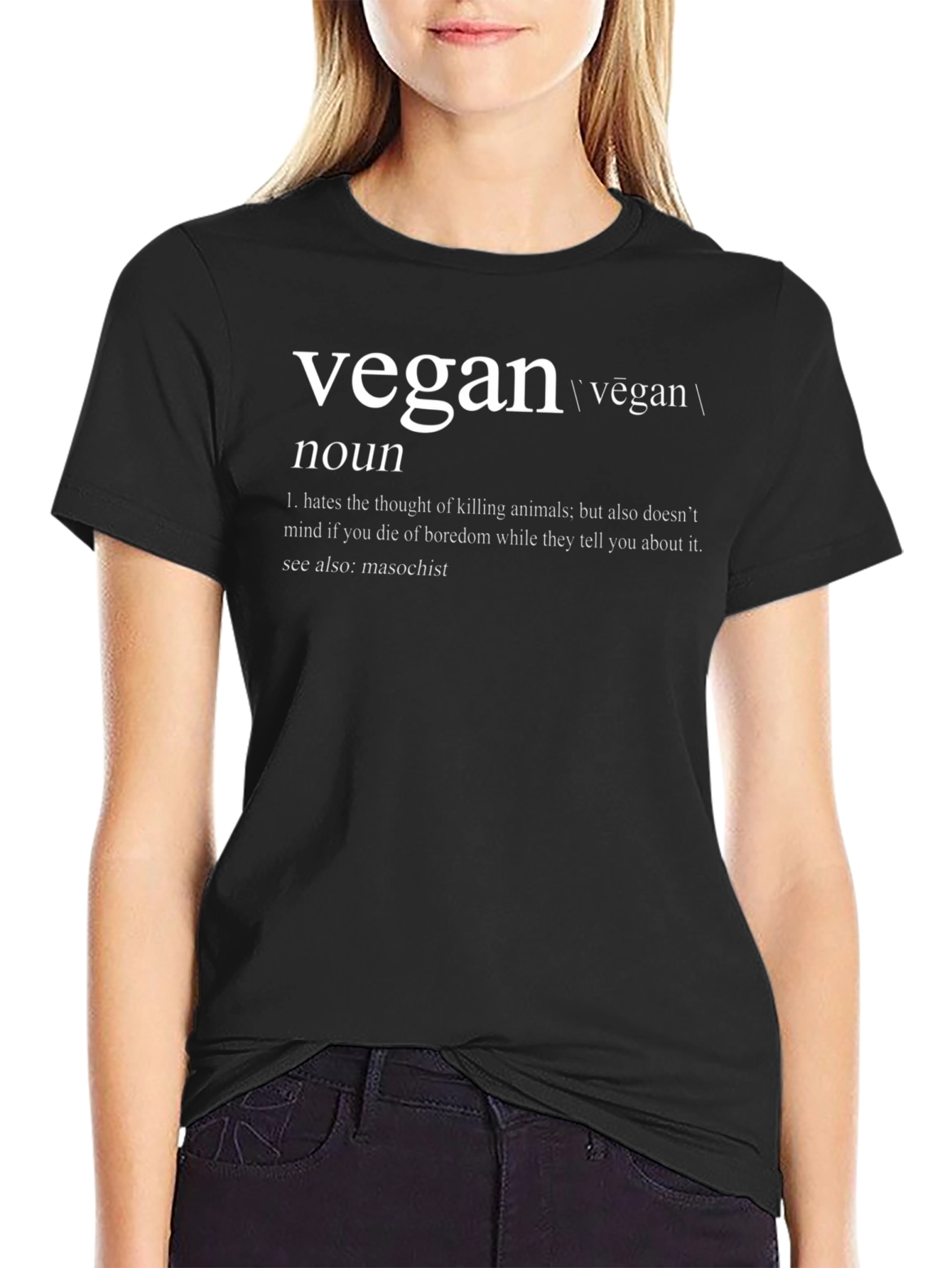 This black t-shirt features a bold, white graphic that defines the word "vegan" in a humorous way. Displayed like a dictionary entry, it playfully describes a vegan as someone who "hates the thought of killing animals" but also "doesn't mind if you die of boredom while they tell you about it." Made from a comfortable-looking fabric, this tee is perfect for everyday wear and showcasing your vegan lifestyle with a touch of wit. It's a conversation starter and a fun addition to any casual wardrobe. Show off your plant-based pride!