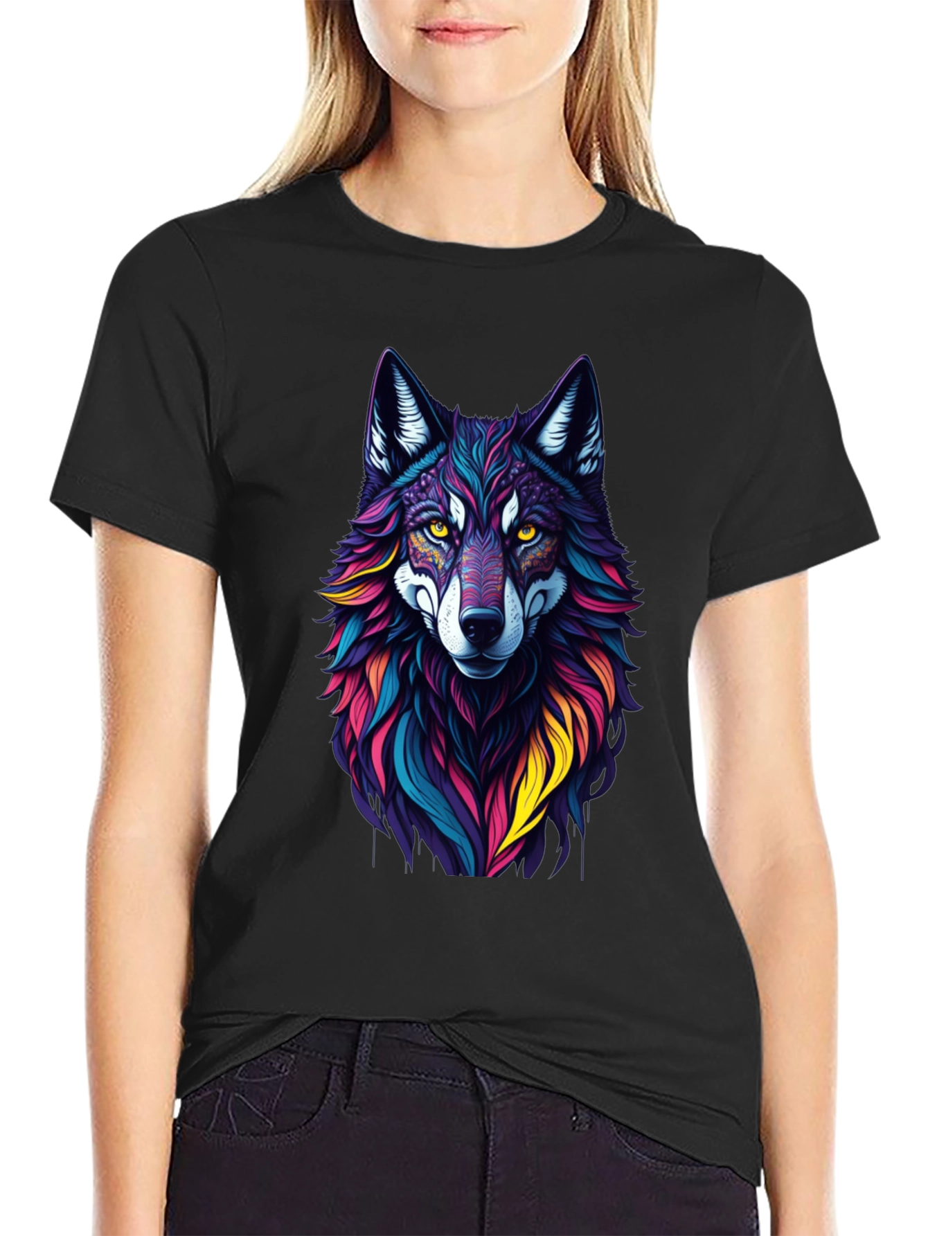Stand out with this striking men's black t-shirt featuring a vibrant, artistic wolf graphic. The design showcases a colorful, almost neon palette, creating a visually stunning focal point. Made from a comfortable-looking fabric, this tee appears to be a relaxed fit, perfect for everyday wear. The vivid wolf design offers a unique style statement, ideal for casual outings, concerts, or adding a pop of color to your wardrobe. Elevate your look with this eye-catching and expressive piece, a must-have for those who appreciate distinctive and bold fashion.