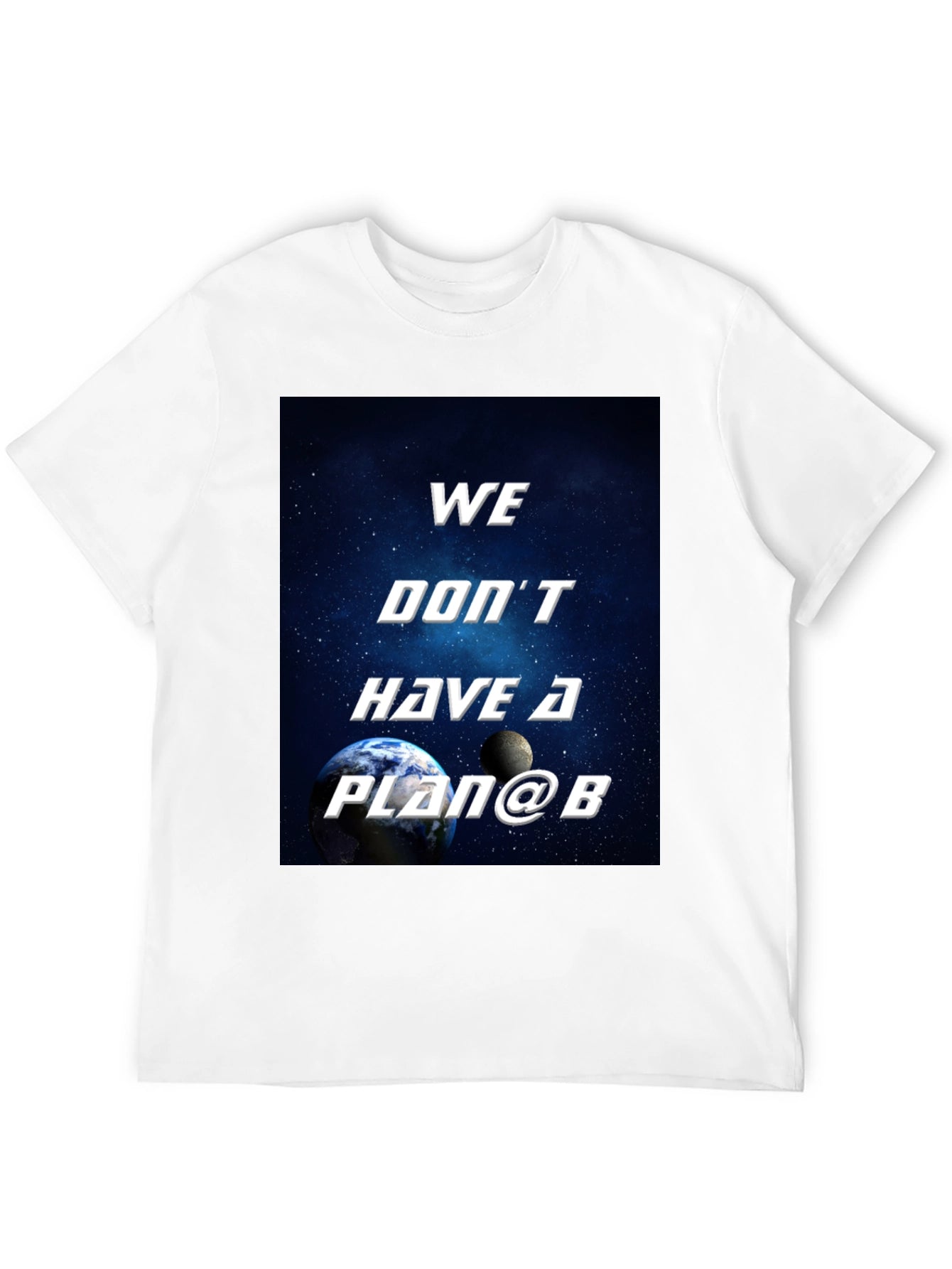 Explore the universe in style with this eye-catching black t-shirt featuring a striking graphic design. The shirt boldly declares "We Don't Have a Plan B" against a cosmic backdrop of stars and planets. This unique design is sure to turn heads and spark conversations. Made from comfortable, breathable fabric, it's perfect for everyday wear or special occasions. Whether you're a space enthusiast or simply appreciate bold fashion statements, this tee is a must-have addition to your wardrobe. Show off your daring spirit and make a statement with this standout piece. Get yours today and embrace the unknown!