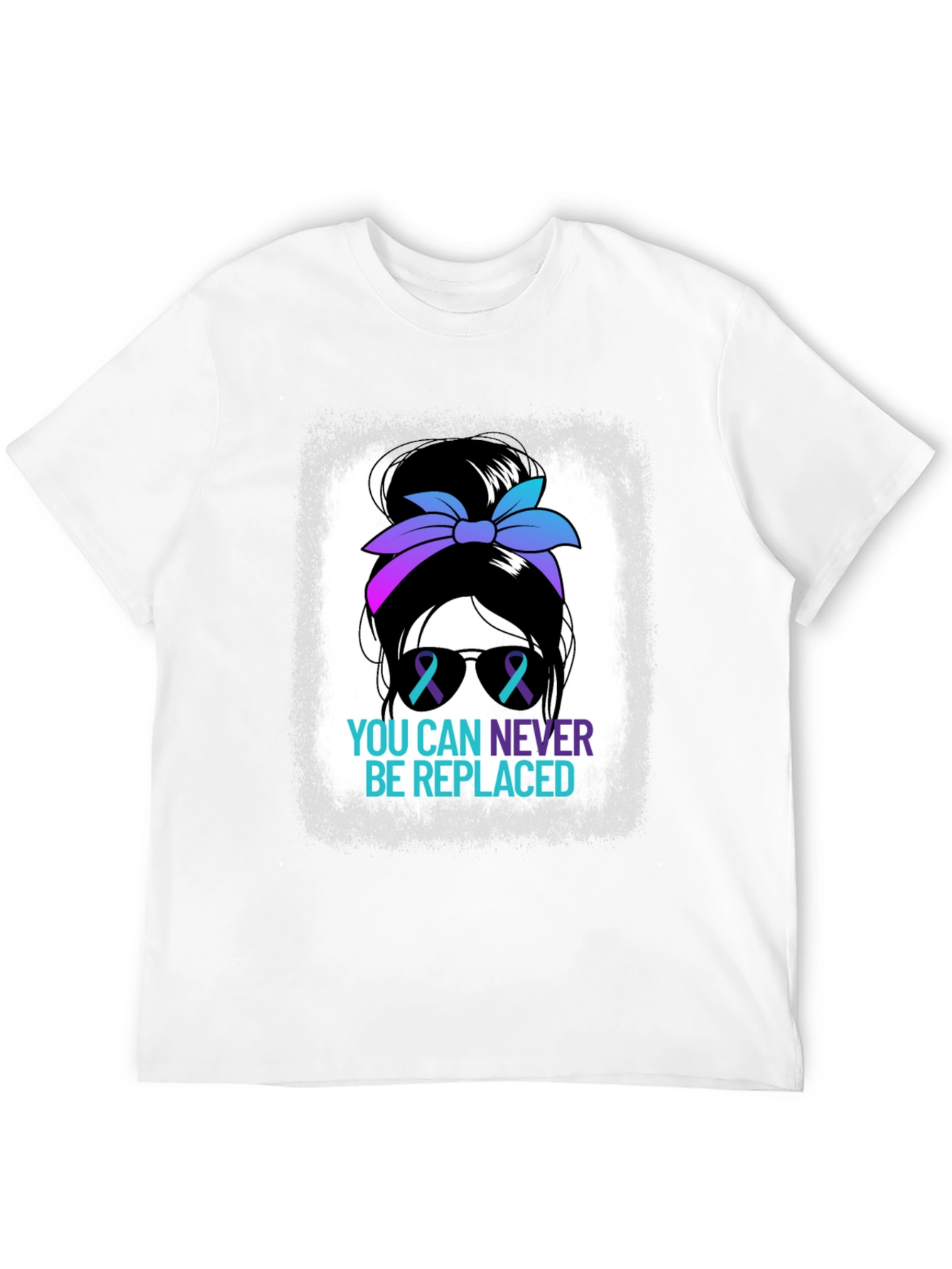 This stylish black t-shirt features a unique graphic design of a woman's silhouette with a messy bun and sunglasses. A colorful awareness ribbon adds a pop of color to the design. Above the image are the words "YOU CAN NEVER BE REPLACED", making a powerful statement. This t-shirt is perfect for raising awareness, showing support, or simply expressing your individuality. The comfortable fabric and classic fit make it ideal for everyday wear. A great gift for anyone who values standing out and making a difference. Ideal for casual outings, social events, or even just lounging at home. Add this meaningful piece to your wardrobe today!