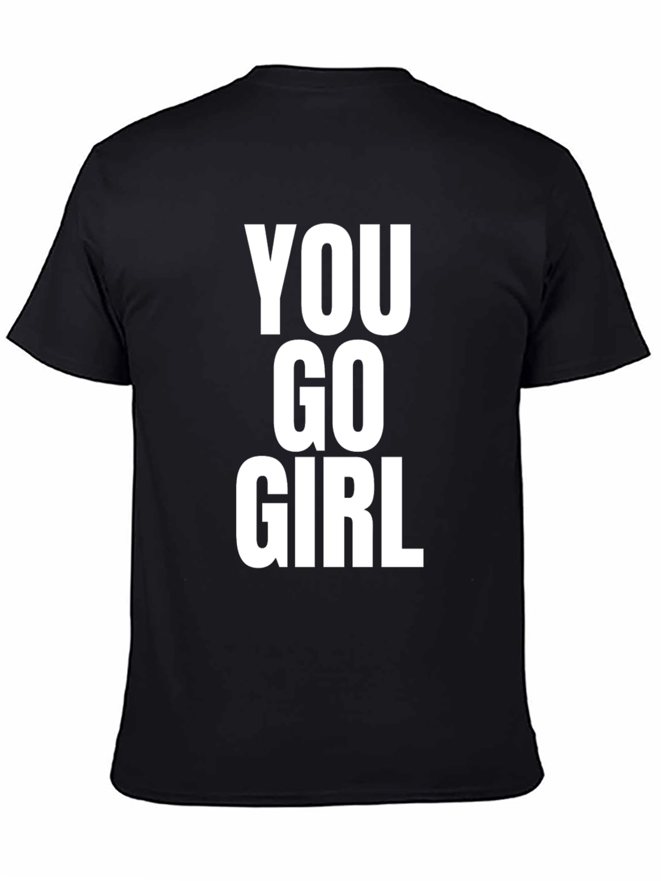 Show your support with this bold "You Go Girl" graphic tee! This classic black t-shirt features a striking, vertically aligned white text design that makes a statement. Crafted from what appears to be a soft and comfortable cotton blend, this tee offers a relaxed fit, perfect for casual wear or making a statement at events. Ideal for expressing encouragement and solidarity, this t-shirt combines comfort with a powerful message. Dress it up or down, wear it solo or layered, this tee is a versatile addition to any wardrobe.